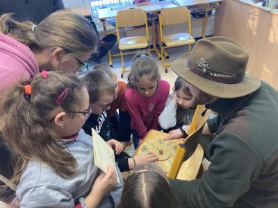 A nepřijeli sami - přijeli s nimi i tři lovečtí psi a také jeden dravec - poštolka. S sebou měli i všechno to, co při těžbě dřeva v lese potřebuje dřevorubec - motorovou pilu, ochrannou přilbu se štítem, vestu, kalhoty, boty a rukavice. A spoustu věcí, které můžeme v lese najít - různé šišky a jehličí, kaštany, bukvice... - ty, ukryté v látkových sáčcích, jsme poznávali hmatem. Děti si mohly zblízka prohlédnout a potěžkat parohy a rohy různých lesních zvířat, vyzkoušet práci s dalekohledy, poslechnout si troubení na borlici a lesnici i zvuk různých vábniček, prohlédnout si obrázky zvířat, stromů a keřů, se kterými se mohou setkat v lese... A na jednom z celkem sedmi připravených stanovišť žáci vyrobili dřevěné ozdoby, díky kterým se pak obyčejný stromeček stal stromečkem vánočním.