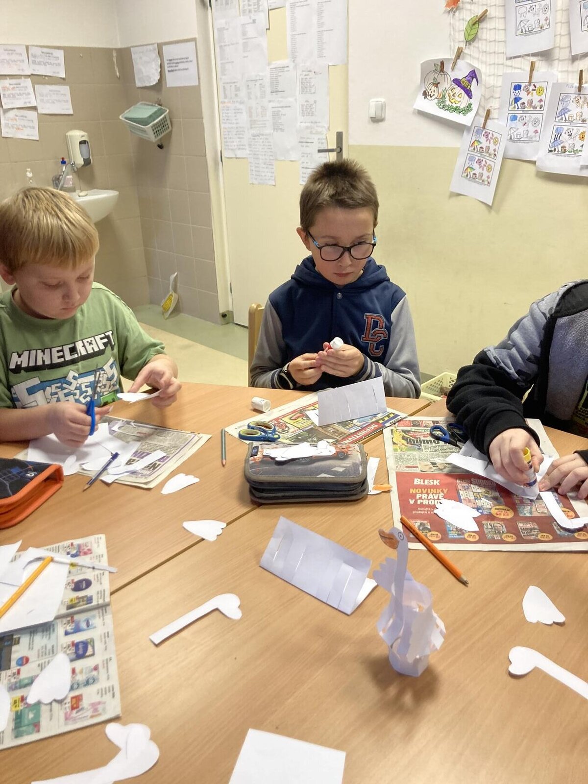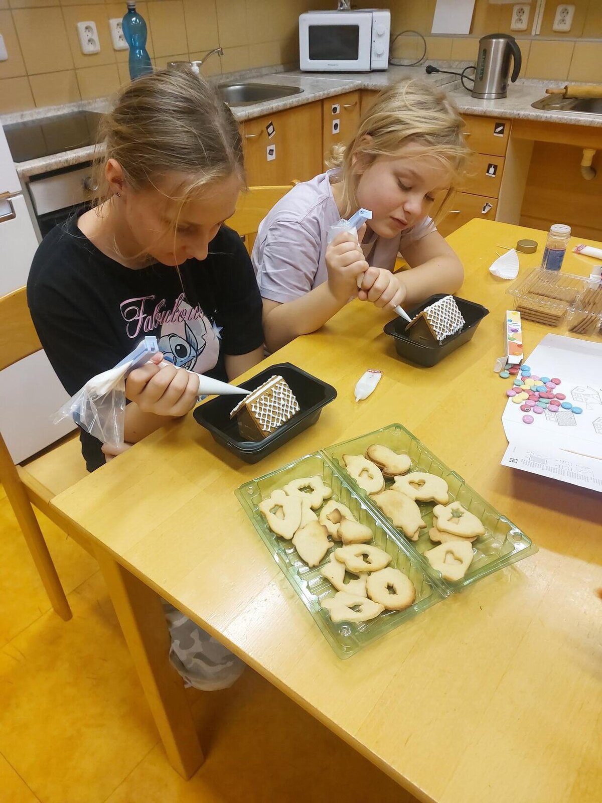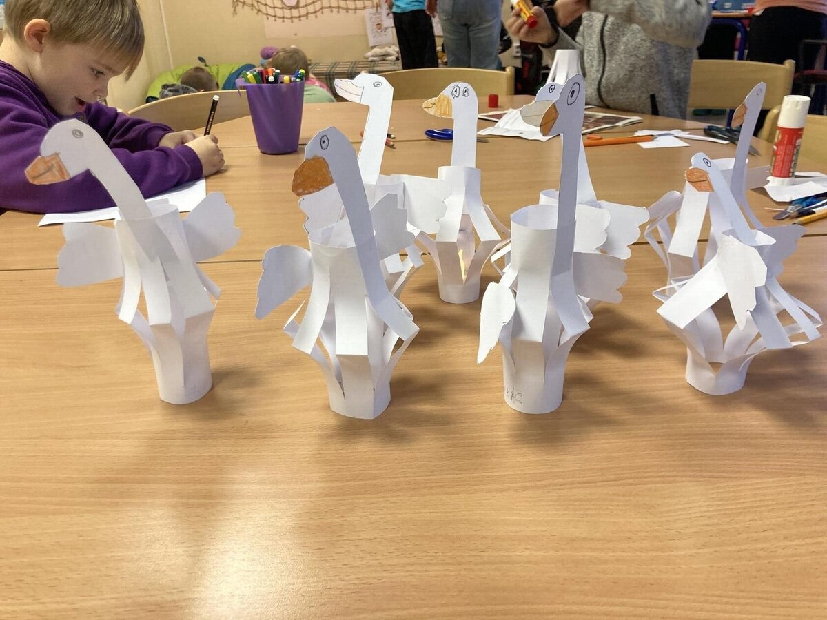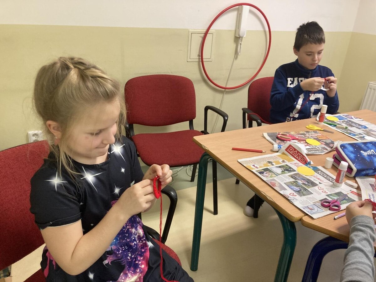 V listopadu a v prosinci jsme vyráběli z papíru husy jako lampičky na svíčku, doplňovali jsme pracovní listy ke Svatému Martinovi, vyráběli jsme výrobky na vánoční jarmark do ZUŠ. Zkoušeli jsme si pomocí kelímku uchopit různé předměty, abychom si uvědomili jak to mají těžké kamarádi, kteří mají problém něco si podat. Vyráběli jsme z korálků hvězdičky, lepili jsme z barevných papírů. Na kroužku vaření jsme si vyrobili perníkové chaloupky.