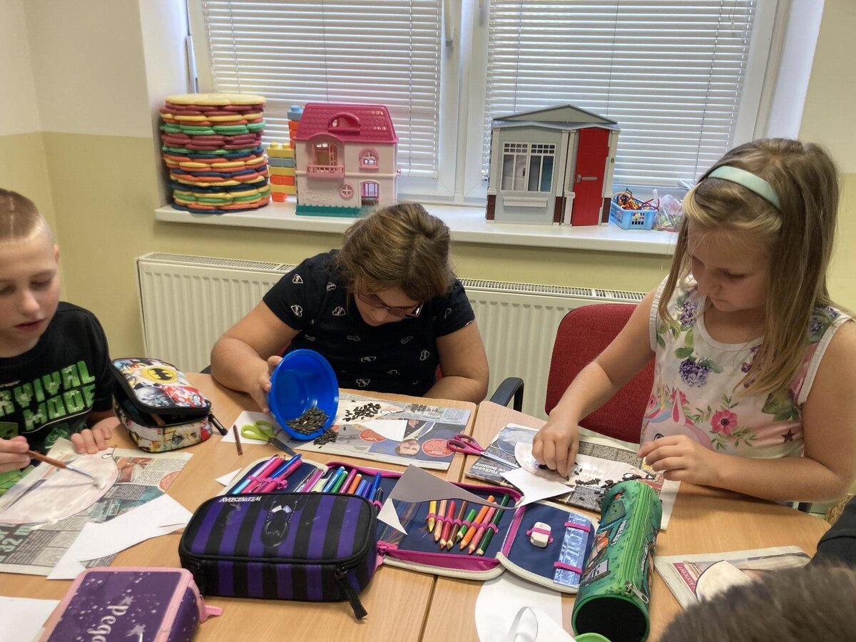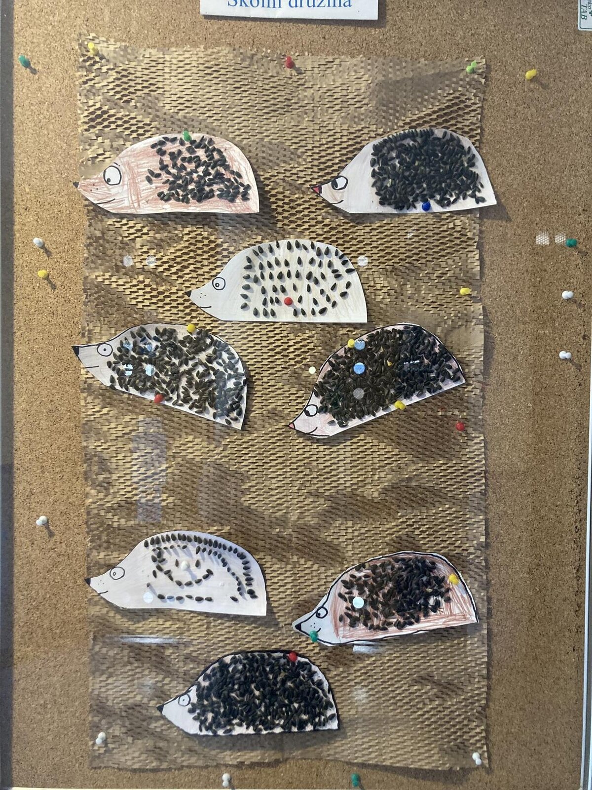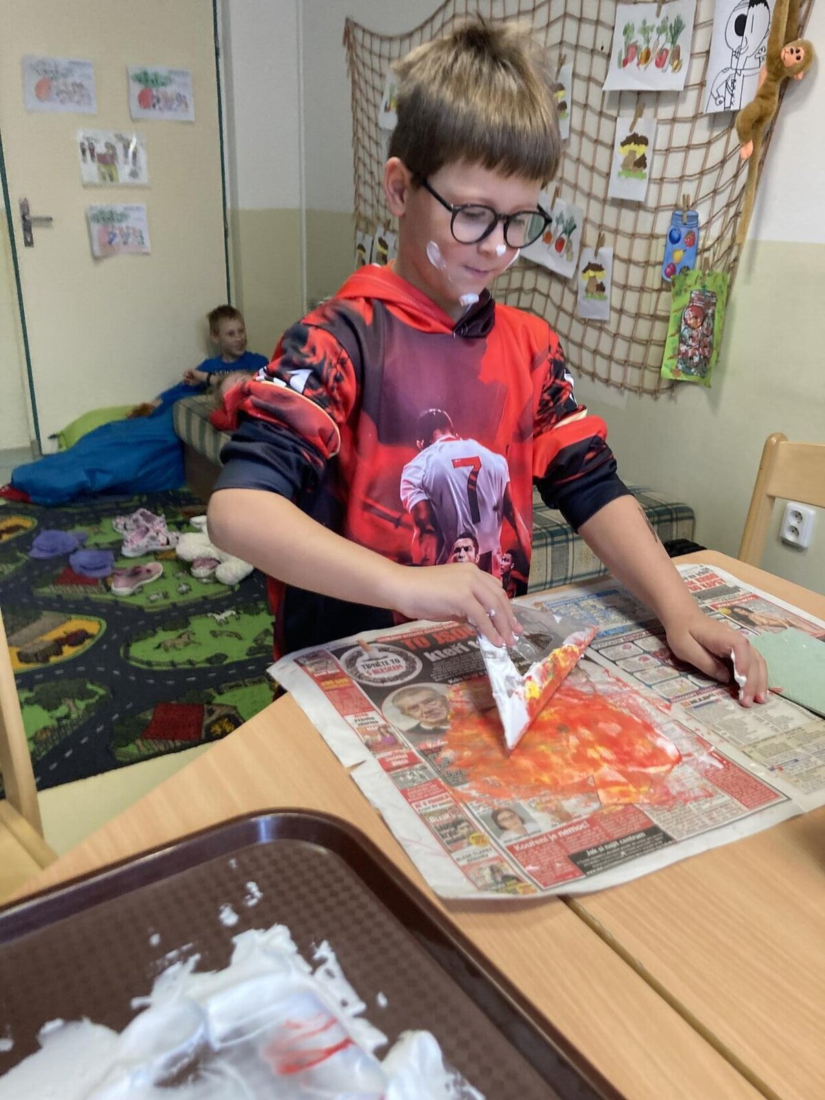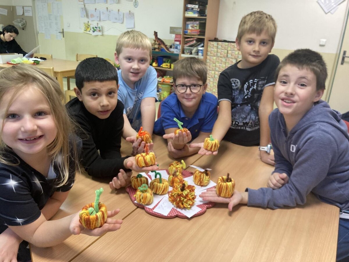 Využili jsme hezkého podzimního počasí a udělali jsme si procházku okolo potoka, relaxovali jsme v nově vybavené místnosti ve škole. Vyráběli jsme ježky ze semínek slunečnice, z vlny dýně, z papíru dýně a žaludy. Vyzkoušeli jsme si pracovat s pěnou na holení a zapustit do ní temperové barvy, abychom vytvořili podzimní list. Při procházce v parku jsme si polepili ruličku listy a vytvořili jsme si podzimáčka, z papíru jsme tvořili houby.