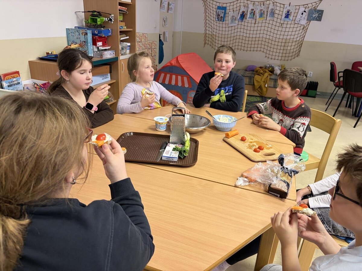 Z papírových kapesníčků jsme vyráběli Tři krále, bobovali jsme ve veřejném parku, tvořili jsme krmítka. Odměnou za vysvědčení byla připravená pomazánka, kterou jsme si namazali na chleba a ozdobili zeleninou.