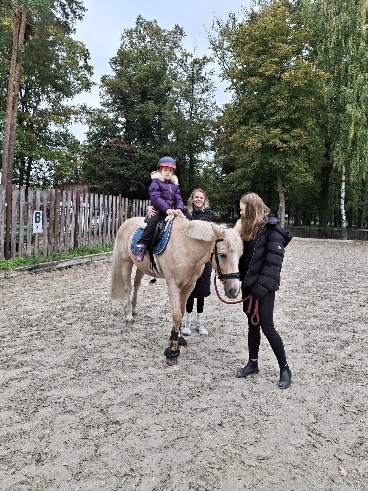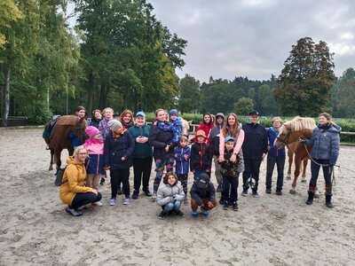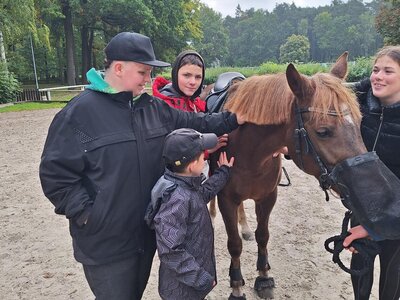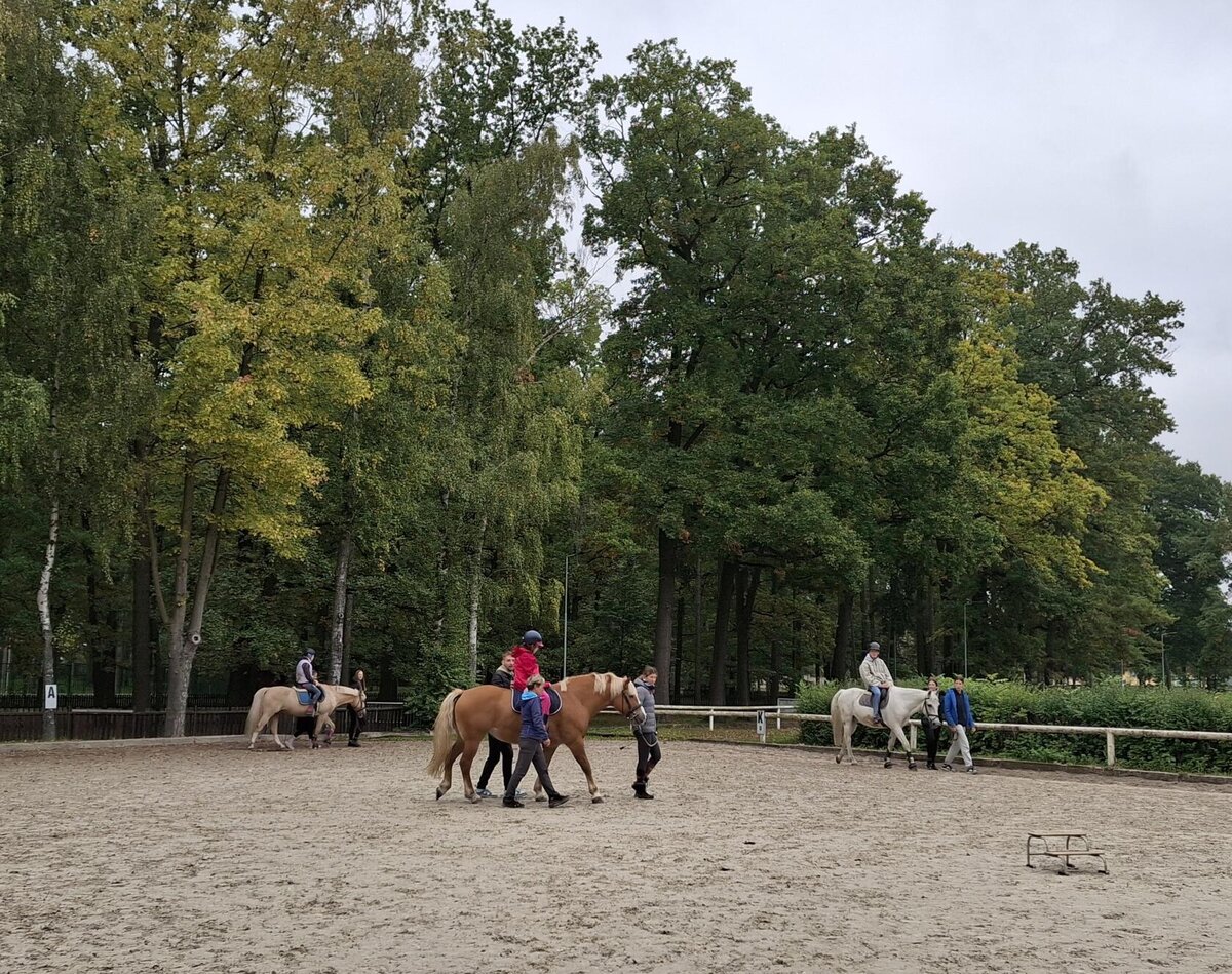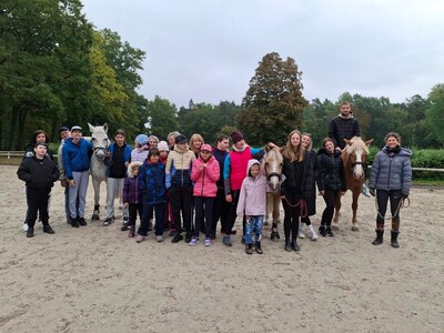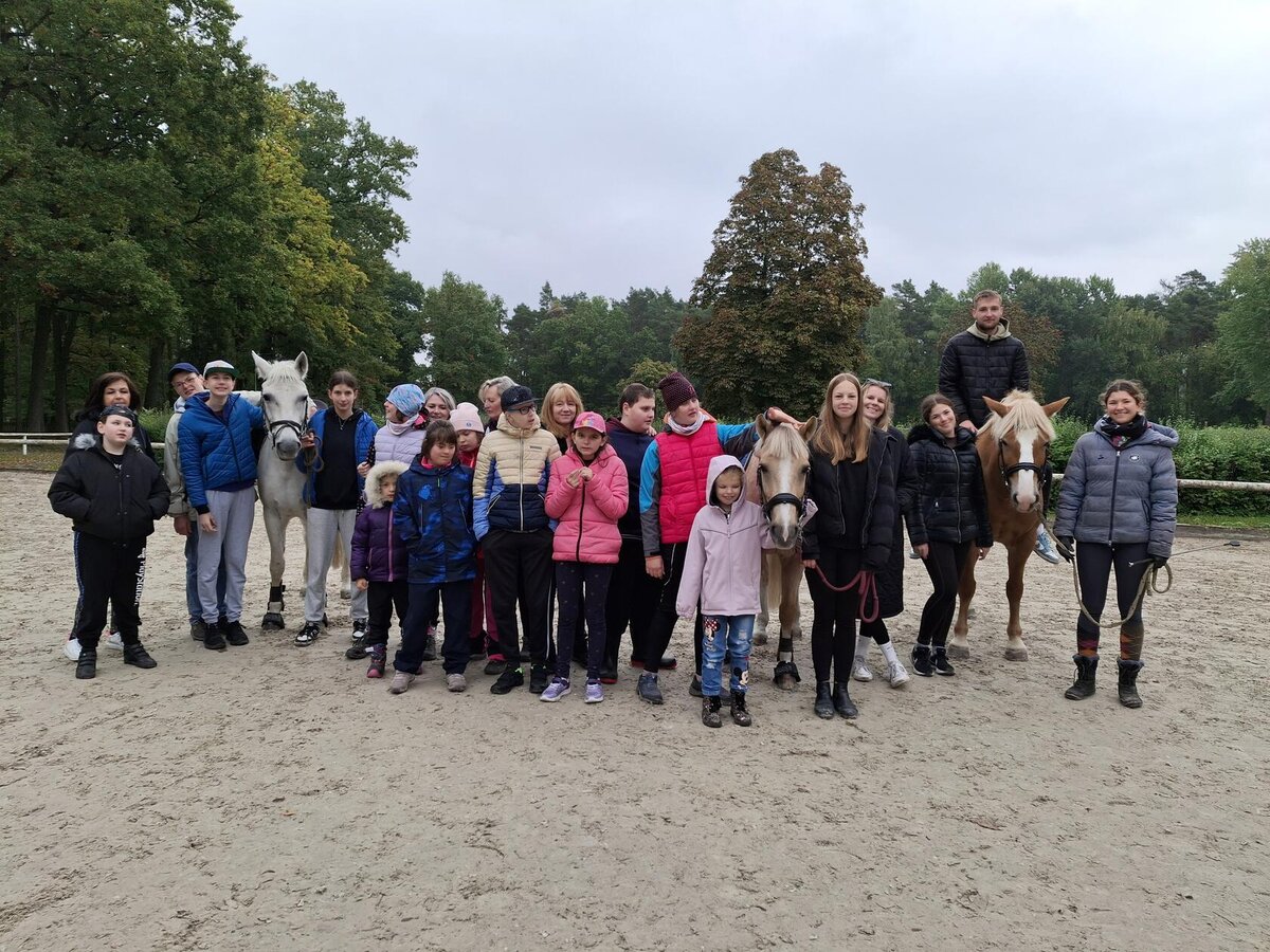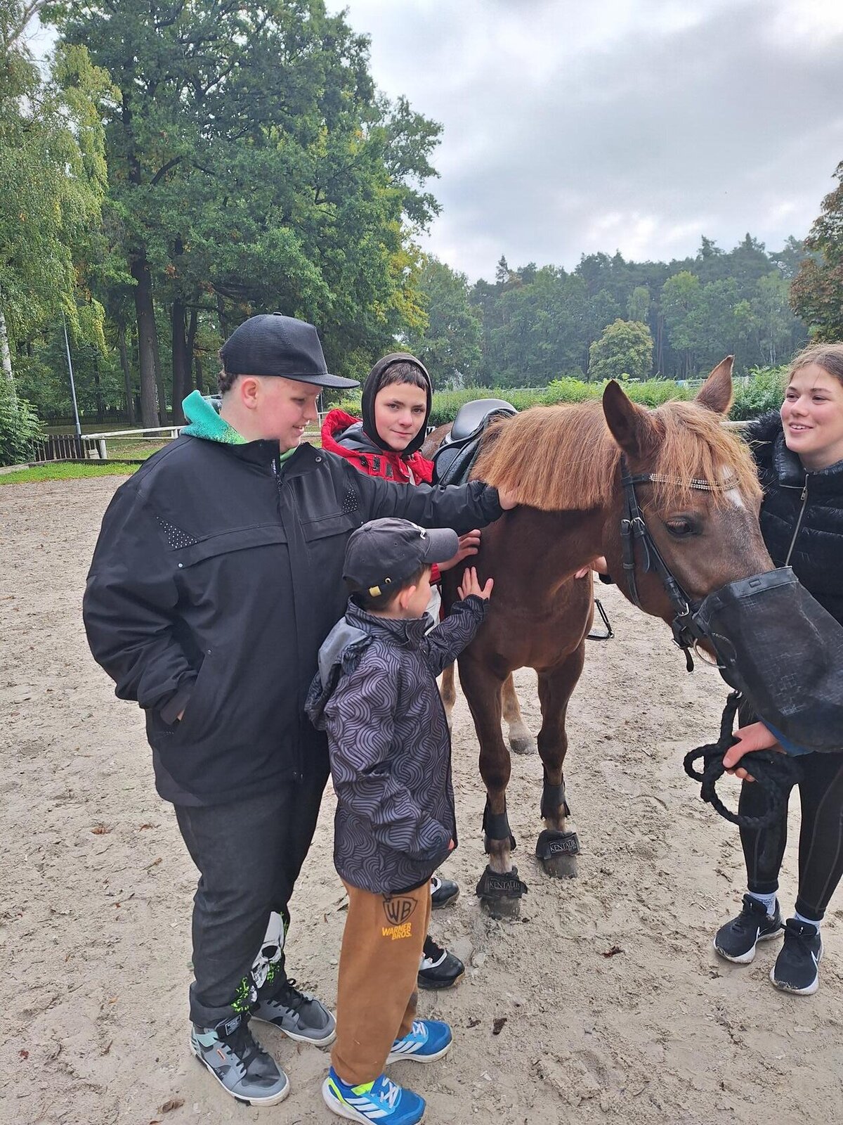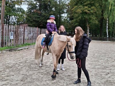 Obě skupiny žáků - ta první cestou zpět do Rakovníka a ta druhá cestou na Čabárnu - se zastavily na kladenském Sletišti, kde žáci vyzkoušeli jízdu na koních Jezdeckého klubu MERCI, z. s. a po ní koníky nakrmili dovezenými dobrotami.