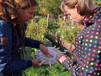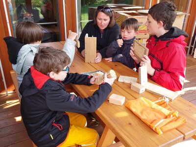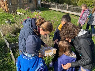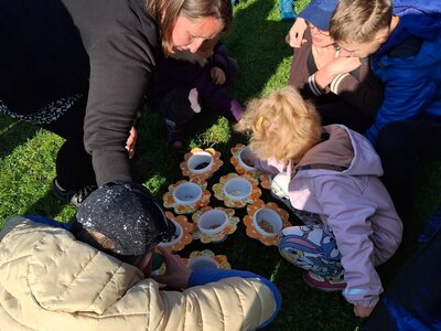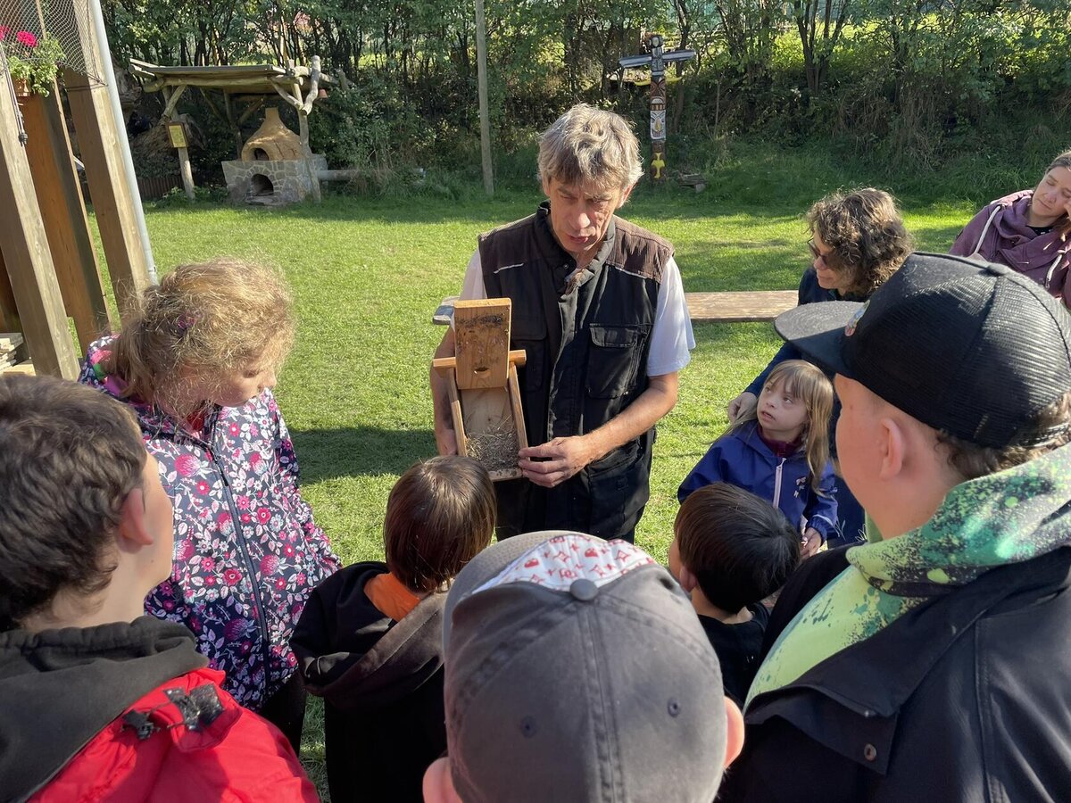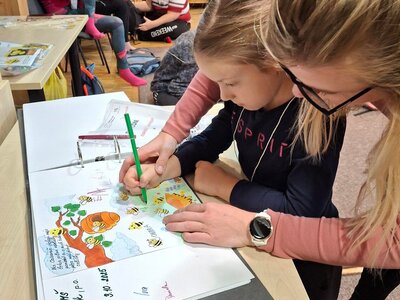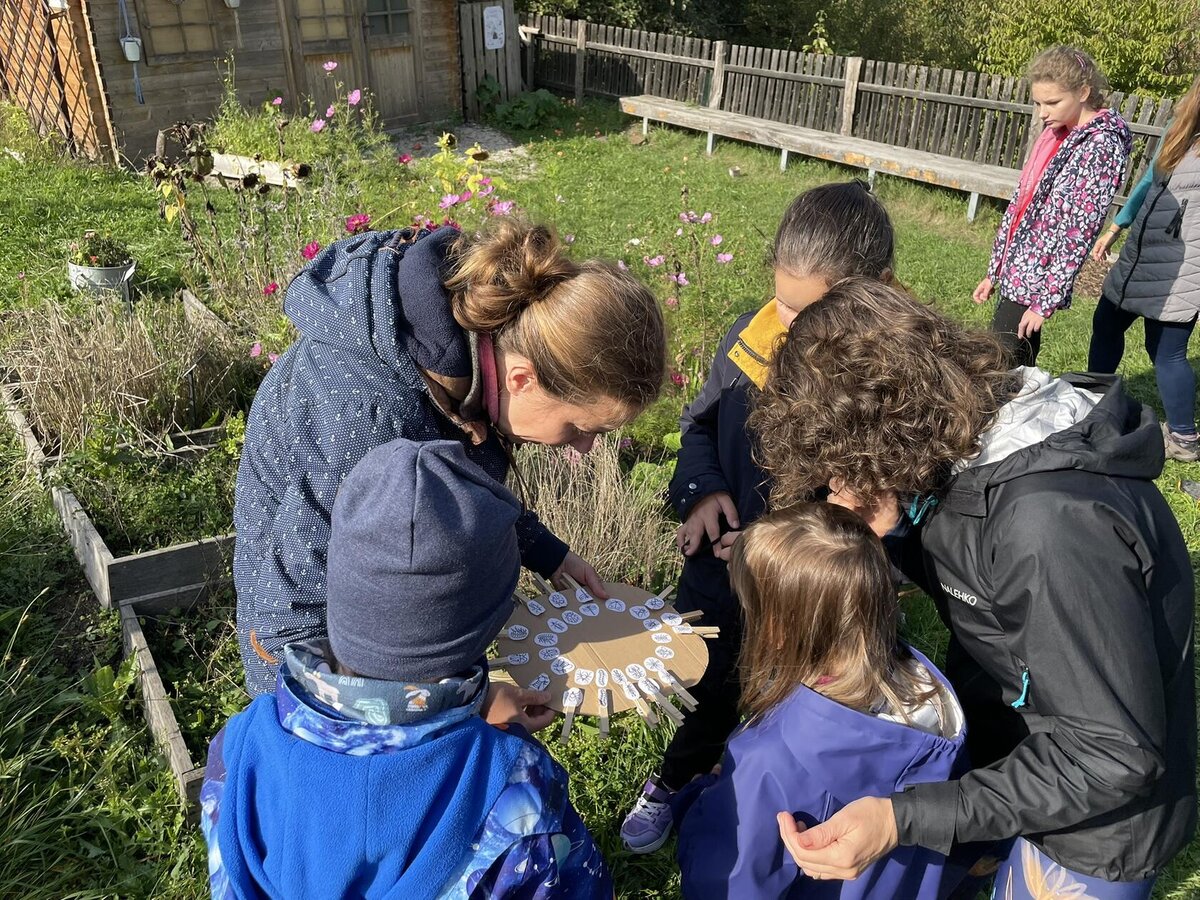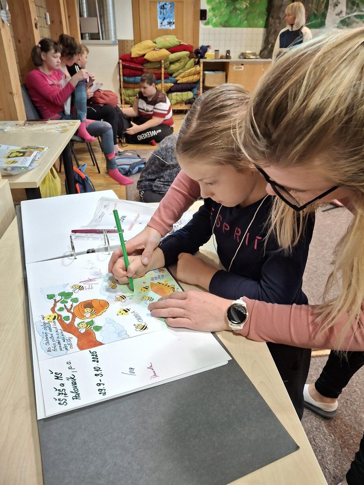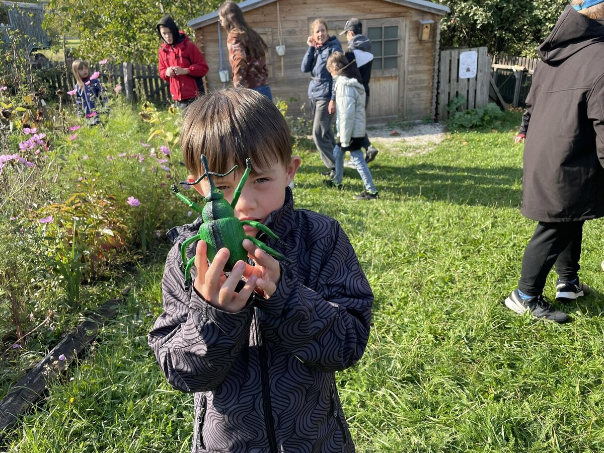 Dopoledne druhého dne jsme strávili ve světě opylovačů – prostřednictvím různých aktivit jsme zjišťovali "Kdo to bzučí v sadu" - tak se jmenoval program připravený lektory NSEV. Skládali jsme rozstříhané obrázek včely, vosy, čmeláka, drvodělky, pestřenky, zednice, čalounice, okáče a babočky, zdobence (to všechno jsou zástupci hmyzu, kteří jsou důležitými opylovači). Pracovali jsme s modely vývojových stádií včely (vajíčko, larva, kukla, dospělec) a povídali si o tom, jakým způsobem se členové včelího společenství podílejí na životě v úlu (a také vybarvili obrázky čističek, krmiček, kojiček, stavitelek, strážkyň a létavek). Venku jsme se podívali na hmyzí domeček, který opylovači, s nimiž jsme se právě seznámili, využívají. A zkusili složit modely různých hmyzích domečků. V zahradě a sadu jsme hledali obrázky nejznámějších zástupců hmyzu a zahráli si hru, díky které jsme lépe porozuměli tomu, jak k opylování hmyzem dochází.