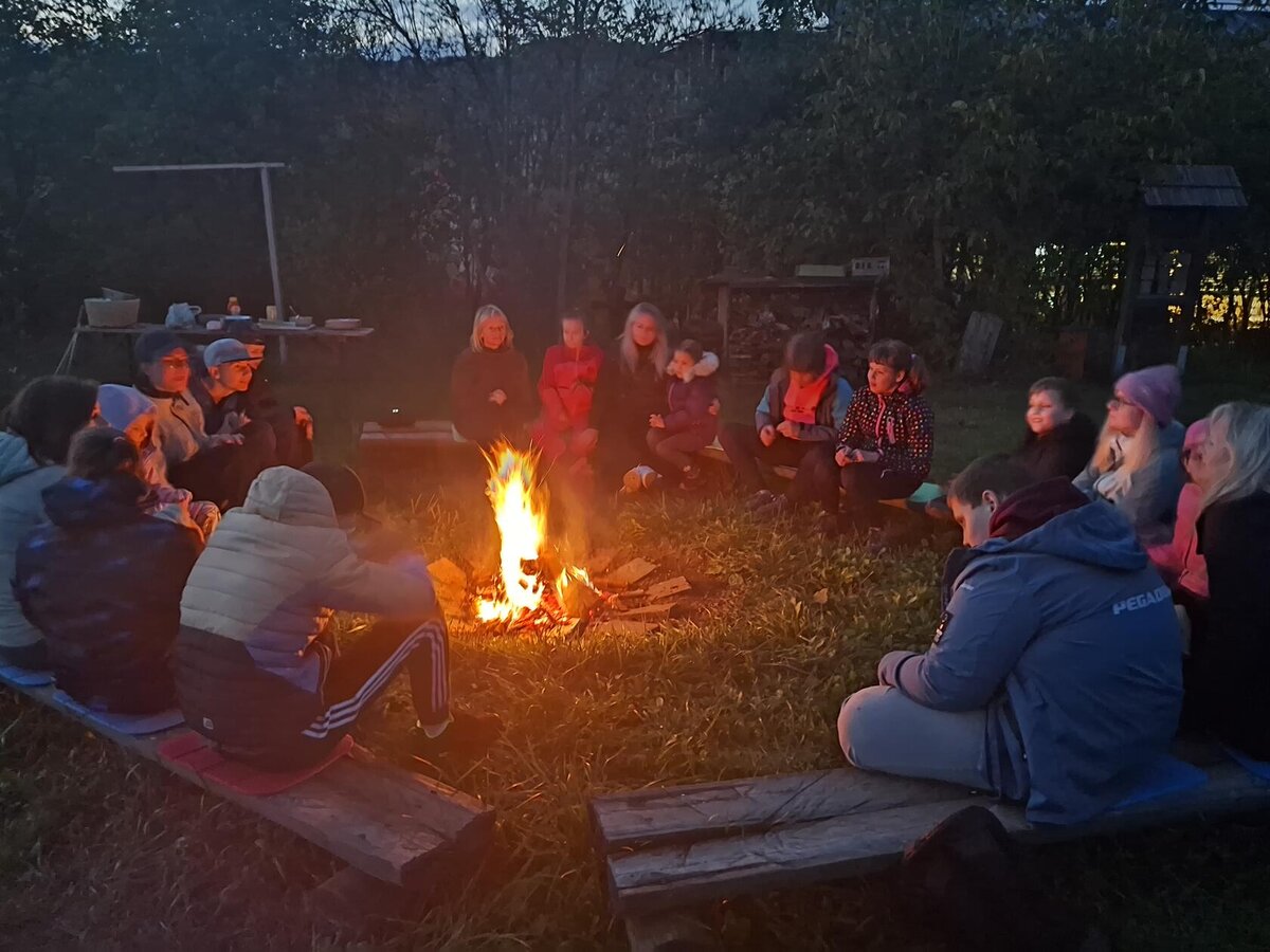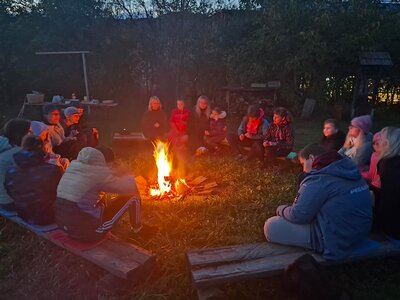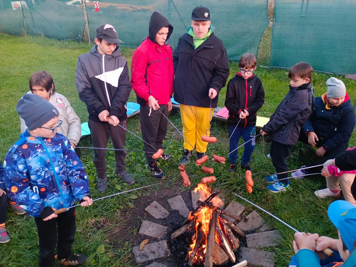 A večer jsme si u ohně opekli buřty a zazpívali si. Před spaním jsme ještě stihli vyprávění pohádky O koblížkovi.