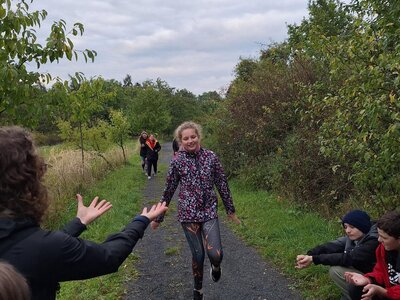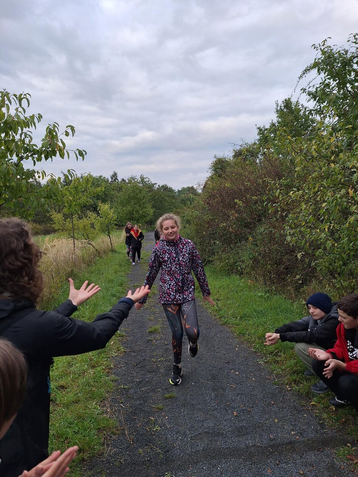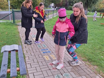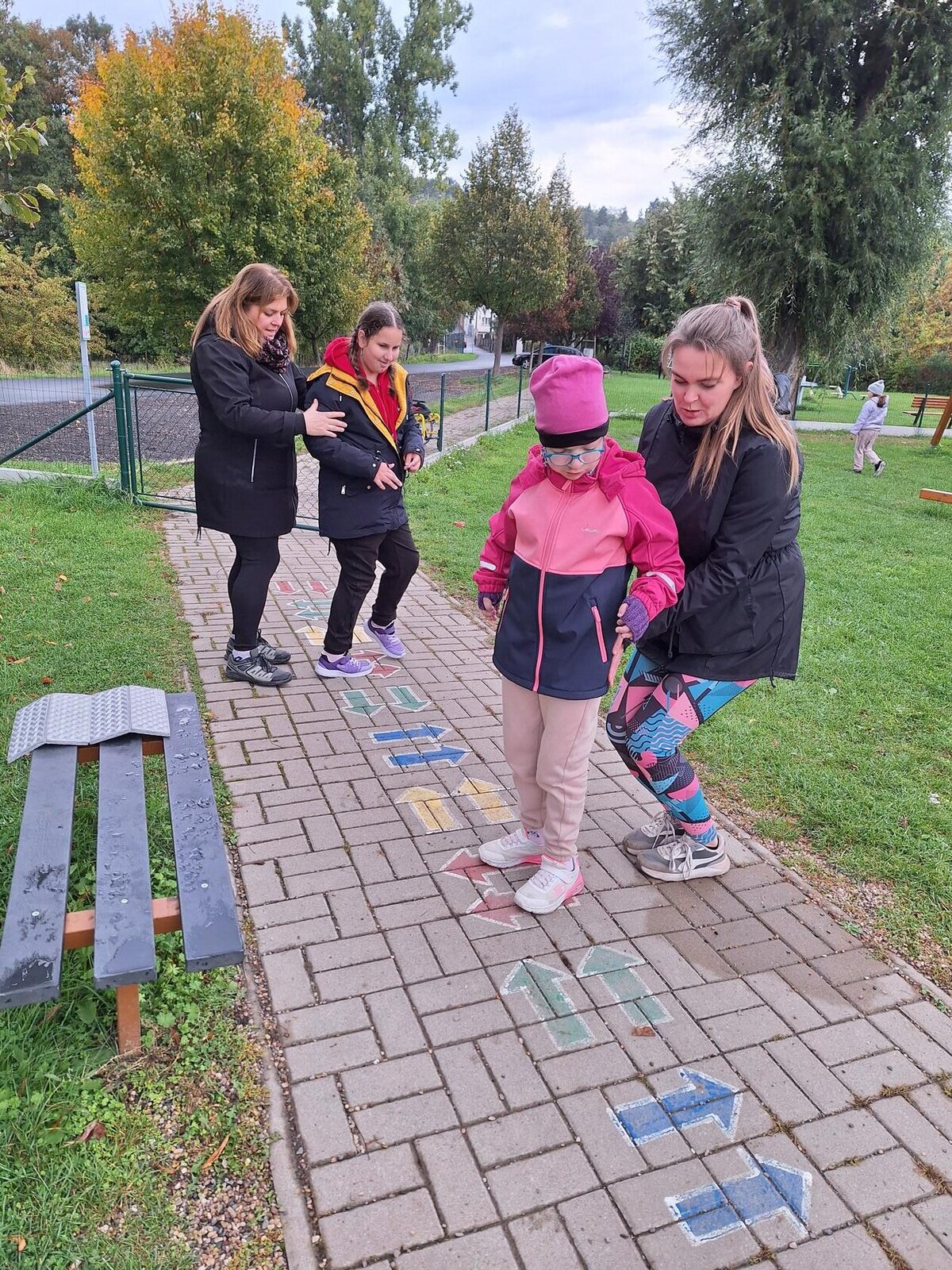 Po svačině jsme vyrazili na dlouhou procházku na hřiště v Brandýsku. Cestou jsme plnili řadu úkolů, našli kešku https://kesky.cz/zaciname-s-geocachingem/co-je-to-geocaching/ a na hřišti procvičili obratnost a prostorovou orientaci s využitím malovaných chodníkových "skákacích" her.