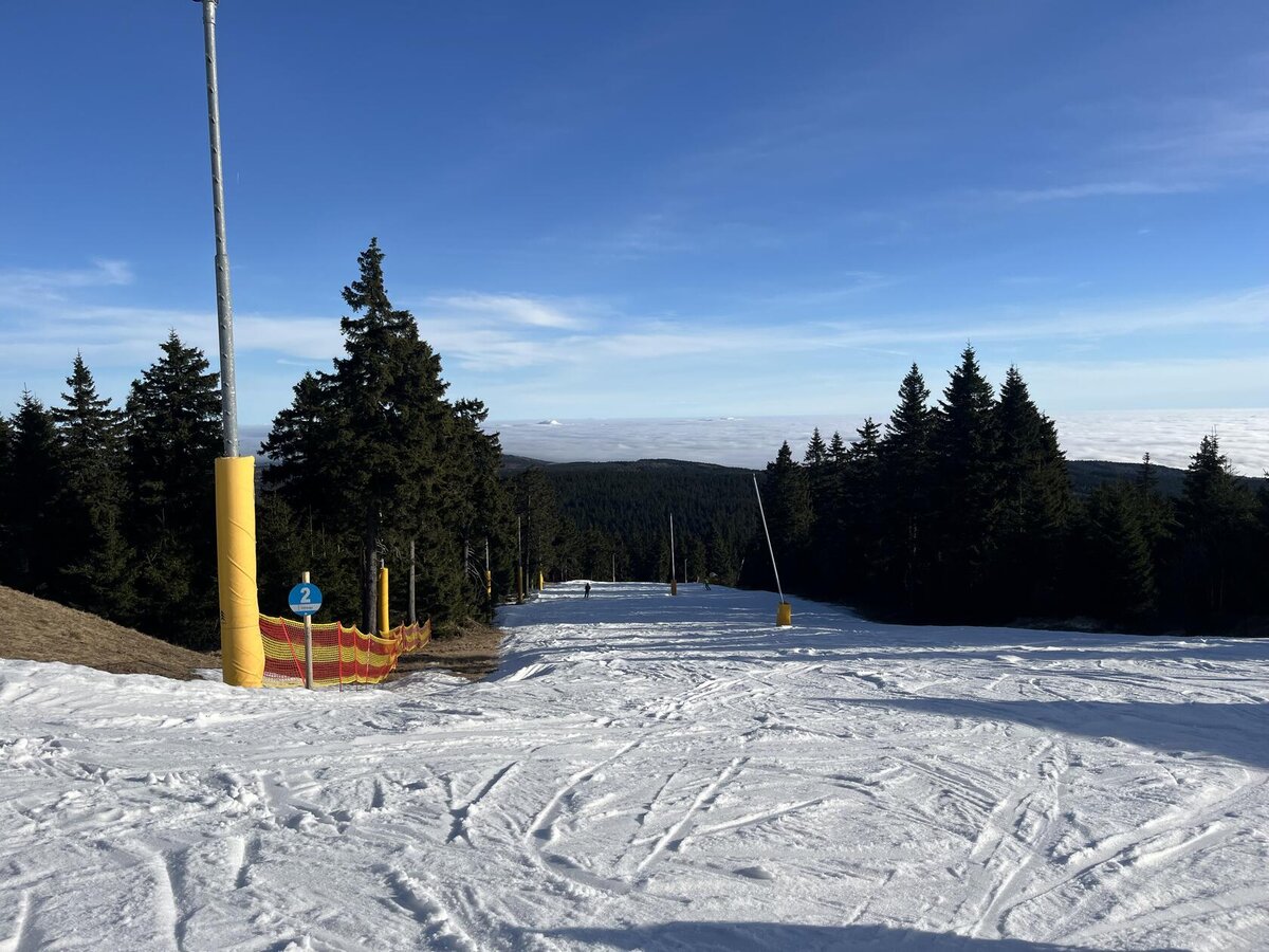 Všude SLUNCE a to je to nejkrásnější. Malá skupinka lyže na Klínovci (nemohou všichni, technický sníh je velmi náročný), ostatní krásná vycházka.