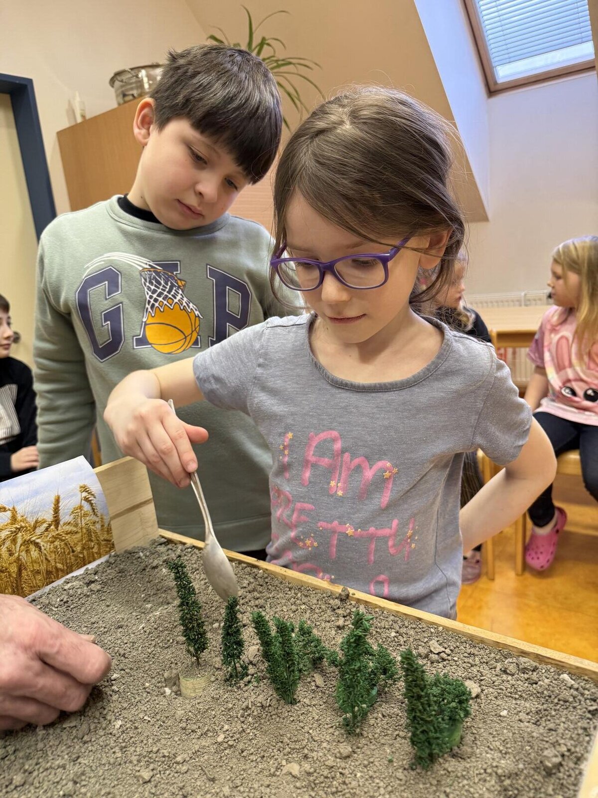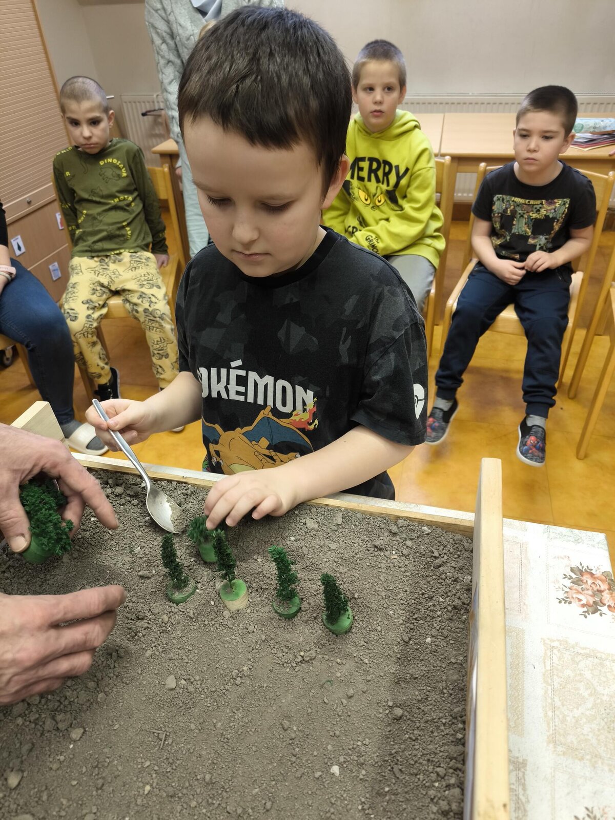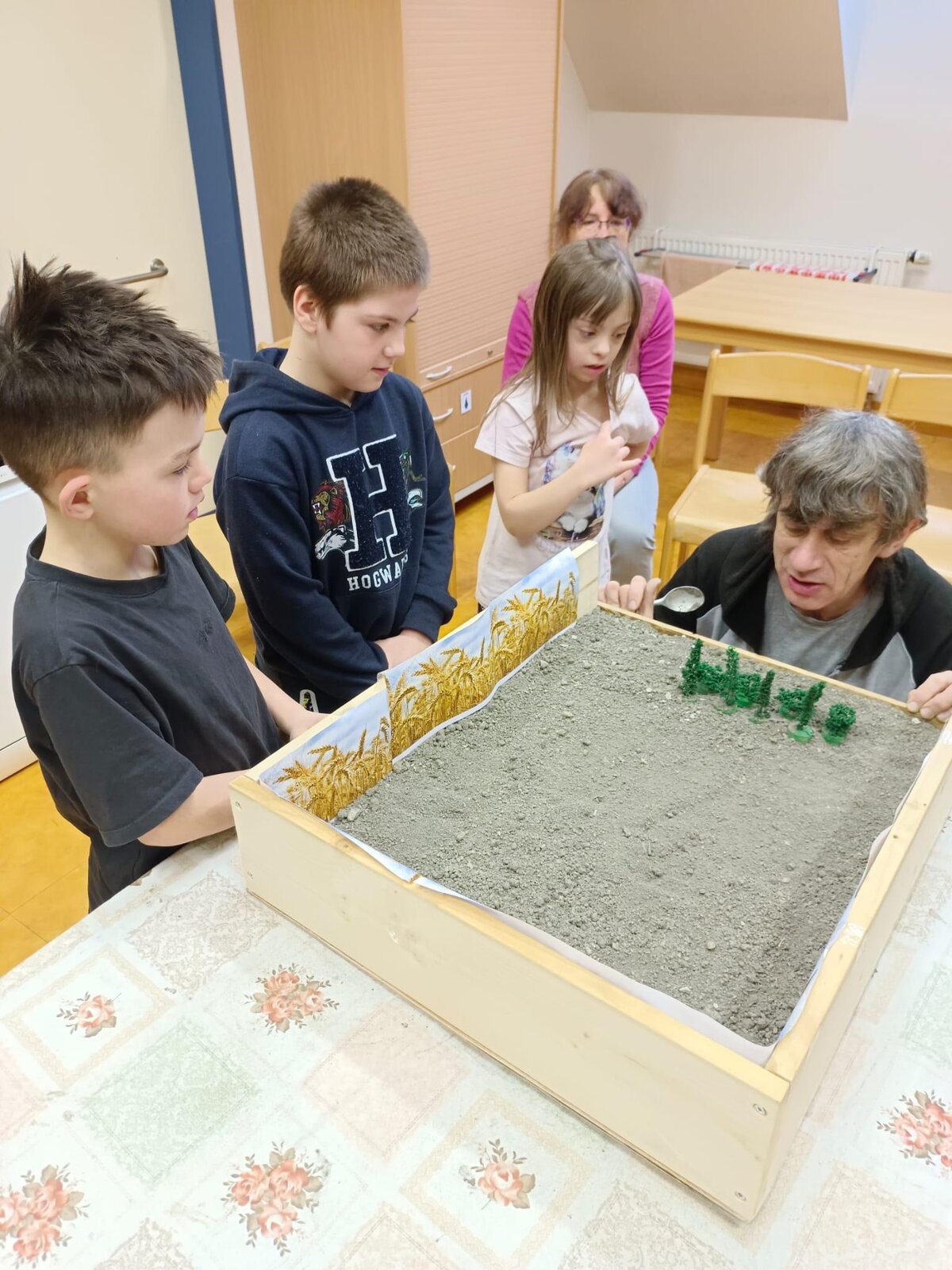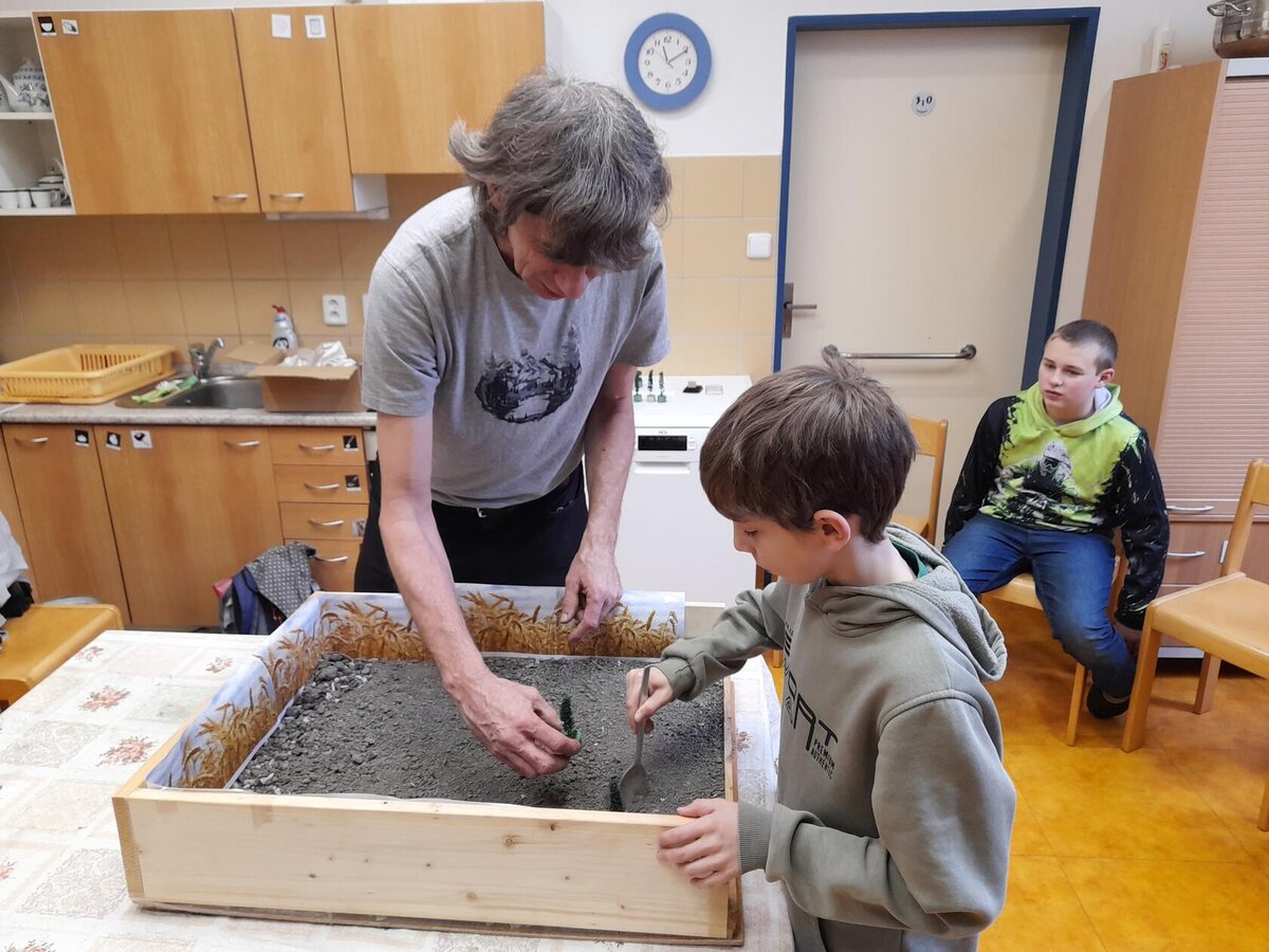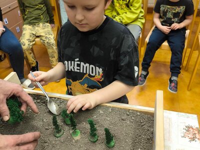 Na modelu si všichni vyzkoušeli, jak větrná eroze půdu ohrožuje a jak lze půdu výsadbou dřevin před erozí chránit.