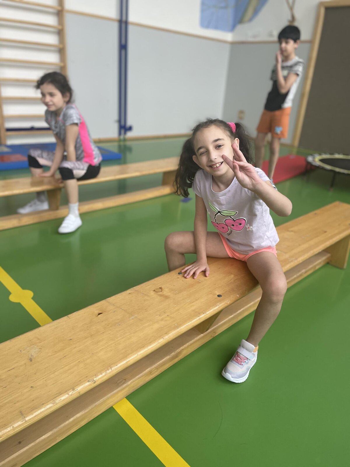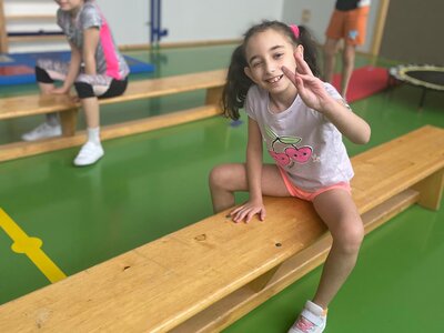 V rámci tělesné výchovy jsme trénovali koordinaci pohybu: běh po nerovném povrchu, skákání na trampolíně, překonávání překážek i přeskoky přes lavičku.